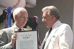 In the final years of his life, Buck became recognized for writing poetry, culminating in national attention for his poem "For America", written after the terrorist attacks of September 11, 2001. One of Buck's final public appearances was on September 17, 2001, at Busch Memorial Stadium in St. Louis. It was the first night that Major League Baseball resumed after the terrorist attacks of September 11. Sick with lung cancer and also showing the signs of Parkinson's disease, Buck looked frail and struggled to maintain his composure.[36] He concluded by silencing critics who thought baseball had come back too soon: "I don't know about you, but as for me, the question has already been answered: Should we be here? Yes!"[37]