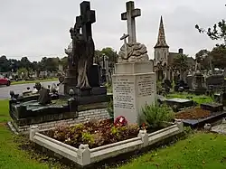 Jack Cornwell was initially buried in a common grave (Square 126 Grave 323) in Manor Park Cemetery, London, although his body was exhumed on 29 July 1916 at which he was reburied with full military honours in the same cemetery (square 55 grave 13).[2] Cornwell's father Eli, who died aged 64 on 25 October 1916 from bronchitis during home service with the Royal Defence Corps, was buried in the same grave on 31 October 1916.[3] The epitaph to Jack Cornwell on his grave monument reads,