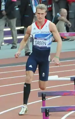 Following his experience at the previous year's World Championships, Green skipped the European Championships in 2012 to concentrate on the Olympics.[1] In May 2012, he won both the 400m and the 400m hurdles at the BUCS Championships which were held at the Olympic Stadium in London.[1] During 2012, he trialled a new technique which involved taking fewer strides. He first tested the technique at the Bislett Games in Oslo, finishing in sixth place after hitting seven out of ten of the hurdles on the course. After the Bislett Games, he spoke to former hurdler Kriss Akabusi who gave him advice as he suffered from similar issues during his career.[4] Green placed second in the 400m hurdles at the British Olympic Trials, behind his training partner and World Champion, Dai Greene.[5]