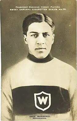 Jack Marshall was a strong all-round player, and over the course of his career he tried out almost every position the seven-man game had to offer. During his junior years in Pointe-Saint-Charles in Montreal, beginning in 1894, he started out as a goaltender. Although he was a right-handed shot he would later play on the left wing with the Winnipeg Victorias in the Manitoba Hockey Association, because the team lacked adequate enough left-handed options. With the Montreal Wanderers he first played as a centre forward, and in the second half of his career as a defenceman.[6] He also played occasionally at right wing and as a rover.