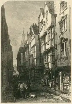 Unable to support her family without her husband's income, Sheppard's mother sent him to Mr Garrett's School, a workhouse near St Helen's Bishopsgate, when he was six years old.[2] Sheppard was sent out as a parish apprentice to a cane-chair maker, taking a settlement of 20 shillings, but his new master soon died. He was sent out to a second cane-chair maker, but Sheppard was treated badly.[4] Finally, when Sheppard was 10 years old, he went to work as a shop-boy for William Kneebone, a wool draper with a shop on the Strand.[5] Sheppard's mother had been working for Kneebone since her husband's death. Kneebone taught Sheppard to read and write and apprenticed him to a carpenter, Owen Wood, in Wych Street, off Drury Lane in Covent Garden. Sheppard signed his seven-year indenture on 2 April 1717.[5]