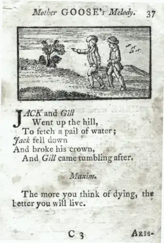 The earliest version of the rhyme was in a reprint of John Newbery's Mother Goose's Melody, thought to have been first published in London around 1765.[2] The rhyming of "water" with "after" was taken by Iona and Peter Opie to suggest that the first verse might date from the 17th century.[3] Jill was originally spelled Gill in the earliest version of the rhyme and the accompanying woodcut showed two boys at the foot of the hill.