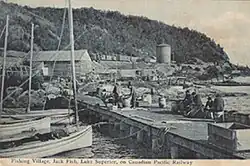 In 1895 Jackfish was established as a port to receive coal required as fuel for steam trains travelling on the CPR.[5] A dock outfitted with cranes allowed large ships to unload their cargo.[1] From this point, the coal was loaded into cars and delivered to CPR coaling depots such as Schreiber and White River. With the increased activity of steam locomotives shunting cars around, a large water tower was located near the railway tracks.