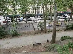 A curved concrete stair, which separates the dance floor terrace to the south and the promenade to the north, leads upward from 148th Street and Bradhurst Avenue to a landing at Edgecombe Avenue, just south of 150th Street. A path winds upward from the intersection of 150th Street and Bradhurst Avenue to the same landing. An additional path leads from 153rd Street at Bradhurst Avenue to Edgecombe Avenue's intersection with 155th Street and the 155th Street Viaduct.[17] The paths predate the WPA renovations in 1936. The WPA removed some of the original paths to make way for the recreational fields, while repaving these paths with hexagonal pavers. Some of the paths subsequently were repaved in asphalt.[16]