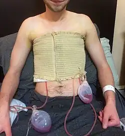 A Jackson-Pratt drain (also called a JP drain) is a closed-suction medical device that is commonly used as a post-operative drain for collecting bodily fluids from surgical sites. The device consists of an internal drain connected to a grenade-shaped bulb or circular cylinder via plastic tubing.[1]