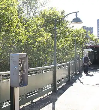 Both platforms have an elevated Queen Anne style station house near their rears, and there are no crossovers or crossunders between the platforms.[17]: 3 The station houses are staggered by about 200 feet (61 m).[17]: 5 Designed by Heins & LaFarge, the station houses consist of steel framing topped by hip roofs. The center bay of each station house includes projecting dormers used for ventilation. The top of the center bay includes a decorated gable that is supported by corbels. The red metal roof overhangs the station house and contains fleur-de-lis ridge cresting. The interiors of each station house include a small wooden-floored waiting area, as well as a niche where there was formerly a radiator. There were also restrooms inside the station houses, but these were later converted to storage areas. C-shaped brackets support signage.[17]: 4 The staircases from each station house to street level are covered by canopies and have elaborate handrails.[17]: 5–6