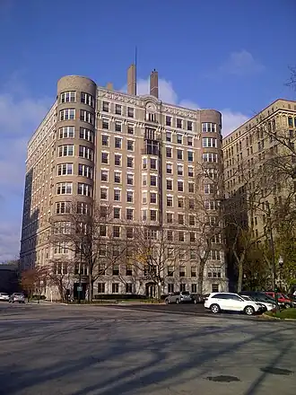 The Jackson Shore Apartments are a historic apartment building in the Hyde Park neighborhood of Chicago, Illinois. The building was built in 1916–18, at which time Hyde Park was a popular and growing neighborhood. Architects Rapp & Rapp, who were more famous for their work on theaters, designed the Classical Revival building; the style, which conveyed dignity and luxury to apartment-seekers, was a departure from their more elaborate theater designs. The eleven-and-a-half story building's design includes towers at the front corners, detailed stonework on the first floor, a bracketed stringcourse below the top floor, and a frieze above the top floor. The interior continues the classical theming with wood paneling and egg-and-dart molding. While many luxury apartment buildings were built in Hyde Park in the early 20th century, the Jackson Shore Apartments are one of the few well-preserved surviving examples.[2]