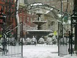 Perhaps because of the opening of the larger Bleecker Street Playground in 1966[28] there was less of a need for Jackson Square Park to remain a children's playground. In 1990 a capital reconstruction project was completed that changed the park to reflect what is seen today. It included planting new greenery and restoring the historic iron fencing and benches. The centerpiece, a new cast-iron fountain with planters and a granite base, evokes the 19th-century origins of Jackson Square Park but is newly constructed.[29]