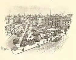 By August 1888, the City Parks Commissioner officially opened “Jackson Park” after four months of construction. Improvements included a new gateway, an asphalt walk ten feet wide around the interior, 300 feet in length and the circuit of the park, along which seats were placed. A drinking fountain was added. Described in city documents and newspapers only in its initial year as "Jackson Park," the name "Jackson Square Park" took hold by 1889.[23] Samuel Parsons later described the design for Jackson Square Park: “Walks…wound around the outskirts along the fence, leaving a border for planting of five or ten feet...[while] the central space was made a great bouquet of brilliant flowers and leaves...the central showy bedding, flanked and nested as it were among masses of trees and shrubs."[21]