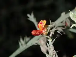 Jacksonia calcicola is a prostrate spreading or erect shrub that typically grows up to 0.2–1.5 m (7.9 in – 4 ft 11.1 in) high and 1–2 m (3 ft 3 in – 6 ft 7 in) wide, its branches greyish-green. Its end branches are 2–13 mm (0.079–0.512 in) long and 1.0–1.5 mm (0.039–0.059 in) wide, flattened, curved backwards and sharply-pointed. The leaves are reduced to pale brown, triangular scales, 0.6–2 mm (0.024–0.079 in) long and 0.8–1.8 mm (0.031–0.071 in) wide. The flowers are scattered along branches on a pedicel 3.0–4.5 mm (0.12–0.18 in) long. There are lance-shaped bracteoles 0.75–1.5 mm (0.030–0.059 in) long and 0.6–1 mm (0.024–0.039 in) wide on the pedicels. The floral tube is 1.2–1.4 mm (0.047–0.055 in) long and the sepals are membranous, the lobes 7.0–7.2 mm (0.28–0.28 in) long, 1.1–2.1 mm (0.043–0.083 in) wide and fused at the base. The standard petal is yellow-orange to orange with red markings, 5.9–6.0 mm (0.23–0.24 in) long, the wings yellow-orange with red marking, 6.2–7.1 mm (0.24–0.28 in) long, and the keel orange to red, 5.7–6.0 mm (0.22–0.24 in) long. The stamens have pink filaments 3.9–6.8 mm (0.15–0.27 in) long. Flowering occurs throughout the year, and the fruit is a woody, densely hairy, broadly elliptic pod, 5.5–6.2 mm (0.22–0.24 in) long and 3.6–4.2 mm (0.14–0.17 in) wide.[2][3]