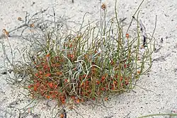Jacksonia rubra is a prostrate, spreading or scrambling, tufted shrub that typically grows up to 15–20 cm (5.9–7.9 in) high and 20–50 cm (7.9–19.7 in) wide. It has greyish-green to mid-green branches, its leaves reduced to egg-shaped, dark brown scales, 0.6–1.8 mm (0.024–0.071 in) long and 0.4–1.2 mm (0.016–0.047 in) wide. The flowers are scattered along the branches on a pedicel 1.4–3.7 mm (0.055–0.146 in) long, with egg-shaped bracteoles 0.7–1.3 mm (0.028–0.051 in) long and 0.45–0.75 mm (0.018–0.030 in) wide with toothed edges. The floral tube is 0.7–1 mm (0.028–0.039 in) long and the sepals are membranous, with lobes 4.3–7 mm (0.17–0.28 in) long, 0.7–1.6 mm (0.028–0.063 in) wide and fused for 0.3–0.4 mm (0.012–0.016 in). The petals are deep orange-red, the standard petal 3–4 mm (0.12–0.16 in) long and 3.5–5.1 mm (0.14–0.20 in) deep, the wings 3.6–4.2 mm (0.14–0.17 in) long, and the keel 3.5–3.7 mm (0.14–0.15 in) long. The stamens have green filaments, 2.0–3.3 mm (0.079–0.130 in) long. Flowering occurs from August to November, and the fruit is a membranous, densely hairy elliptic pod 5–6 mm (0.20–0.24 in) long and 2.8–3.0 mm (0.11–0.12 in) wide.[2][3]
