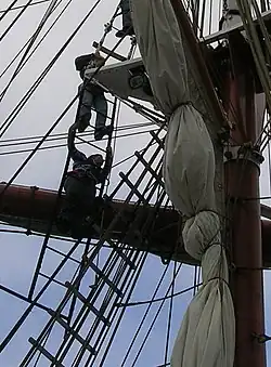 The second type of Jacob's ladder applies to a kind of ladder found on square rigged ships. To climb above the lower mast to the topmast and above, sailors must get around the top, a platform projecting from the mast. Although on many ships the only way round was the overhanging futtock shrouds, modern-day tall ships often provide an easier vertical ladder from the ratlines as well. This is the Jacob's ladder.