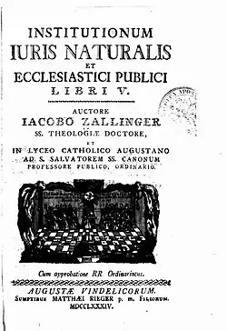 After the suppression of the Jesuits in 1773, Zallinger taught philosophy in Dillingen, and then physics in Innsbruck in 1777 before going to Augsburg at the invitation of Prince-bishop Clemens Wenceslaus of Saxony, who engaged him as professor of canon law, at the College of St. Salvator. He held this position for thirty years (1777-1807). From 1797 to 1802, he also served as rector of the university.[2]