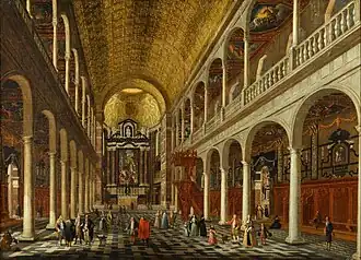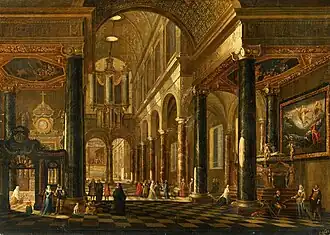 Jacob Balthasar Peeters painted a number of church interiors including of the Jesuit churches of Bruges and Antwerp. This theme was popular in the Low Countries throughout the 17th century. Antwerp artists preferred depicting interiors of high baroque interiors while Dutch artists concentrated on the barren interiors of Protestant churches despoiled of their decorations. In comparison to the earlier church interiors of Flemish and Dutch masters, Peeters' church interiors reflect 18th century artistic preferences through the addition of elegant figures and their attention to detail. One pair of works in the Statens Museum for Kunst in Copenhagen dated 1714 depicts the interior of the Jesuit St. Charles Borromeo Church in Antwerp. A pair of views of the same church were recently on the art market (Lempertz Cologne auction of 19 November 2016). The works created in 1721 show the church in the state before part of its decoration was destroyed by fire on 18 July 1718. In the fire, the interior of the church, including ceiling murals painted by Peter Paul Rubens, was destroyed. Peeters was able to include the lost decorations in these two compositions by using his own compositions which predated the fire such as the works now in the Statens Museum for Kunst.[8]