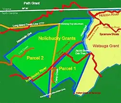 In March 1775 there was a gathering at Sycamore Shoals on the Watauga River of some 600 settlers and 1,200 Cherokee to transact the sale of lands. The lands sold by the Cherokee to the Richard Henderson & Co are described in the Path Grant Deed and the Great Grant Deed. These lands were north of the Holston River in East Tennessee and Southwest Virginia and in Central Kentucky between the Cumberland and Kentucky rivers. The Holston river was generally taken to be the border between Virginia and North Carolina.[4]