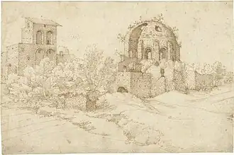 Franckaert painted and drew religious subjects, landscapes and architectural scenes. He collaborated on various paintings with Cobergher. He is now mainly known for a small number of landscape and architectural drawings. The only known signed drawing is The Temple of Minerva Medica and other ruins on the Esquiline, Rome in the collection of the Vatican, which is signed 'Van Franckaert'. This drawing has served as the basis of attributions of other drawings of Roman views in the Berlin Kunstbibliothek, the Louvre and the Rijksmuseum.[7]