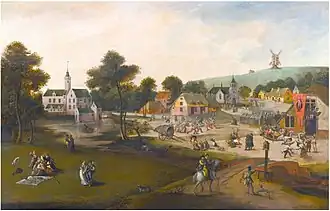 Jacob's extant pictures show explicit connection to the region around Antwerp.[8] Some of his views of Antwerp adhere to the "town-and-country" format, a kind of combination of a rural view with a city view. An example is his panoramic View of the Kiel (1578, Royal Museum of Fine Arts Antwerp) where the city appears only on the far-right distance. Another example is the View of the Scheldt near Antwerp (1587, Royal Museum of Fine Arts Antwerp), which depicts a somewhat different aspect of country pastimes. Only in the distant horizon are the towers of Antwerp visible.[13]