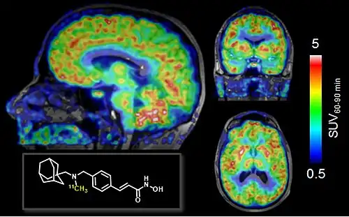 - ^ Wang, Changning; Schroeder, Frederick A.; Wey, Hsiao-Ying; Borra, Ronald; Wagner, Florence F.; Reis, Surya; Kim, Sung Won; Holson, Edward B.; Haggarty, Stephen J.; Hooker, Jacob M. (2014). "In Vivo Imaging of Histone Deacetylases (HDACs) in the Central Nervous System and Major Peripheral Organs". Journal of Medicinal Chemistry. 57 (19): 7999–8009. doi:10.1021/jm500872p. PMC 4191584. PMID 25203558.