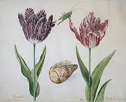 Jacob Marrel was born in Frankenthal. He moved with his family in 1624 to Frankfurt, where he became a student of Georg Flegel in 1627. Attracted by the high prices for flower still life paintings, Marrel studied from 1632 to 1650[1] with Jan Davidszoon de Heem in Utrecht (city), before returning to Frankfurt, where he married Johanna Sybilla Heim(ius), the widow of Matthäus Merian, who died in 1650. He took on students, and his wife's daughter Maria Sibylla Merian became a renowned painter of flowers and insects, rivalling Rachel Ruysch as a female artist.[2] She later married one of his pupils, Johann Andreas Graff, in 1665, after a 6-year tour he made to Venice and Rome upon completion of his studies under Marrel.[1]