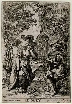 Around 1630–1645, Gouwy provided the design for one of the prints for Frans van den Wyngaerde's series of four prints on the Four times of the day (Quatre heures du jour). His design representing Noon depicts an outdoor scene with a lady staring melancholically into the distance while a gentleman plays a guitar.[8]