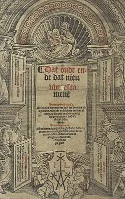 The first Dutch-language Bible printed by Jacob van Liesvelt in 1526 was known as the 'Liesvelt Bible'. It was based to the extent available on Luther's Bible translation. Luther published his German translation of the New Testament in September 1522. In 1523 Luther started his translation of the Old Testament, which was only completed in 1526. The text of the New Testament in the Liesvelt Bible is entirely based on Luther's edition from December 1522. The Old Testament text in the first edition made use of the parts of Luther's Old Testament that were already published and of the Vulgata and other translations. Six editions of this Bible appeared. The Old Testament part of edition of 1532 were based on the new translations of Luther[12] It was thus the most Lutheran edition as it followed Luther's editions closely and included a short prologue that was an excerpt of Luther's prologue to his 1523 edition of the Pentateuch.[13] After that edition, Liesvelt hardly made any changes to his editions. The last and sixth edition appeared in 1542.[12]