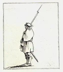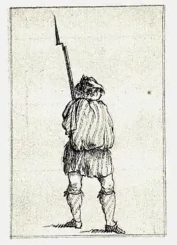 The Jacobite recruiters could not afford to be selective and recruited many who would not have met later conscription standards. While some historical descriptions gave an impression of the Highland rank and file as being tall, healthy men in the prime of life, prisoner returns from after the Rising do not bear this out.[58] The average height of Jacobite prisoners awaiting transportation in October 1746 was 5 feet 4.125 inches:[59] 13.6% were 50 years old and upwards, while a further 8% were 16 and 17 year olds; contemporary observers commented on the "great number of boys and old men" in the Jacobite army.[60] A number were also recorded as having physical and other disabilities: one man of Keppoch's regiment was stated to be a deaf-mute; John MacLennan of Glengarry's had club feet; Hugh Johnston and Matthew Matthews of the Manchester Regiment were blind in one eye and deaf respectively; William Hargrave was described as having a "distemper'd brain" and Alexander Haldane as "wrong in his judgment".[61]