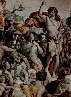 Conte's first frescoes, including Annunciation to Zachariah (1536), Preaching of Saint John the Baptist (1538), and Baptism of Christ (1541) were in the Florentine-supported Oratory of San Giovanni Decollato, in Rome. The Preaching fresco was based on a drawing by Perin del Vaga. In 1547โ48, in collaboration with Siciolante da Sermoneta, Conte completed the fresco decoration of the chapel of San Remigio in San Luigi dei Francesi. In 1552, he painted another work for the San Giovanni Decollato Oratory, the altarpiece Deposition, whose designs are sometimes attributed to Daniele da Volterra.