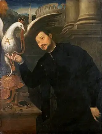 Caraglio was appointed royal goldsmith to Sigismund I in 1545, with a salary (probably more a retainer in modern terms) of 60 zloty, and continued serving under Sigismund II Augustus from 1548, when Sigismund I died. Having taken citizenship in Kraków, he was knighted (as equitatis aureati), with a patent of nobility, in April 1552, after which he made a brief return trip to Italy. It was presumably on this visit that the portrait now in the Wawel Castle in Kraków by Paris Bordone was made to celebrate his knighthood. The royal white eagle has the monogram of Sigismund II on its chest, and the upper background shows the Roman amphitheatre at Verona; on the bench are the tools of a goldsmith rather than a printmaker.[16]