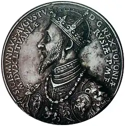 The Renaissance medal was a novelty in the Polish court, but promoted by Bona, and in July 1539 Caraglio wrote to Aretino enclosing two medals, one of Pesenti and the other of Bona, the first evidence of his presence in Poland. Some copies of the former survive, but none of Bona's medal, as of some other recorded ones Caraglio made in Poland.[14] Only one copy survives of the medal he made of Sigismund I in 1538 from the gold sent as dowry for the wedding of Elizabeth of Austria (1526–1545), the first wife of the future Sigismund II, which was handed out to wedding guests.[15]