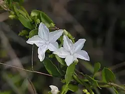 This is a creeping vine that has a woody base and stems that grow up to a meter long.[3] The stems may climb on other plants.[2] The vine produces fleshy leaves up to 3 centimeters long[2] and star-shaped white flowers.[4] The plant grows on barrier islands, where it can be found in several types of habitat, such as sand dunes and tropical hardwood hammocks.[4] It grows in sunny open and disturbed areas, bare patches historically created by hurricanes and today sometimes created by human activity.[2] Other plants growing in this type of habitat include seagrape (Coccoloba uvifera) and Madagascar periwinkle (Catharanthus roseus).[2]