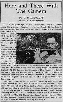 Goulet once owned a flute that had been passed down from generation to generation. A brief history of the flute was written about in an article in The Winnipeg Evening Tribune - June 7, 1934. The last person to have possession of the flute was Robert Leon Goulet (1890-1955). It is not known what happened to the flute after Robert died. In June 2015, descendants of Jacques Goulet's, including the great grandson of Robert Leon Goulet, attempted to locate the flute, but was unsuccessful. In an attempt to locate the flute, the descendants of Goulet have created FindTheFlute.com.
