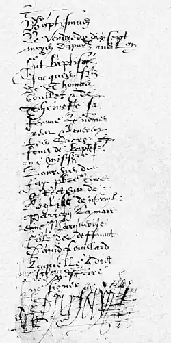 A notarized deed dated April 6, 1615, shows Thomas Goulet purchasing a grey horse for 25 livres from Robert Giguère, a merchant from Tourouvre and a cousin of Robert Giguère who also immigrated to New France.[3] The eldest of three children, Jacques Goulet was born in Normandel on around 1615; his sisters Louise and Yvonne, being born in 1619 and 1622, respectively.[6]
