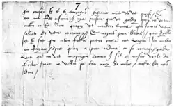 On June 27, 1547, a threatening note was found on St. Pierre Cathedral.[3] The note threatened Calvin and fellow minister Abel Poupin, referring to the recent stabbing of another religious leader, Verli de Fribourg. The next day, Gruet was accused and arrested.[1] Gruet's home was searched and papers were found which showed Gruet's opposition to the religious leaders of the town.[3] On July 2, 1547, Calvin wrote a letter to his friend Pierre Viret in which Calvin stated that although many suspected Gruet of writing the note, the note was not in Gruet's hand.[7] Calvin further stated that the search of Gruet's papers uncovered a number of documents which Calvin described as follows: "a humble petition which he had designed to present to the people in the Assemblies, in which he contended that no offence should be punished by the laws but what was injurious to the state; for that such was the practice of the Venetians, who were the highest authority in the matter of government; and that in truth there was danger with this city submitted to be ruled by the brain of one man of melancholy temperament, of a thousand citizens being destroyed in the event of any outbreak. Letters were also found, clearly written to Andre Philippe, and to others. In some he named me; at other times, he had enveloped me in figures of speech, so clumsily contrived, however, that one could lay his finger on what he meant to conceal. There were, besides, two pages in Latin, in which the whole of Scripture is laughed at, Christ aspersed, the immortality of the soul called a dream and a fable, and finally the whole of religion torn in pieces. I do not think he is the author of it; but as it is in his handwriting, he will be compelled to appear in his defence, although, it may be, that he has himself thrown into the form of a memorandum according to the turn of his own genius, what he heard from others;" [8] Imprisoned for a month, he was tortured and confessed to libeling Calvin, but did not name any accomplices.[2] The day of his death, Gruet was marched from his prison at l'Eveche to the Hôtel de Ville, a route which brought him past his own home.[3] He was beheaded on July 26, 1547.[2]