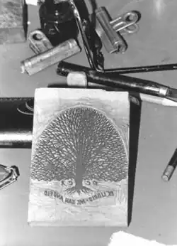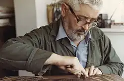 ![]() Jacques Hnizdovsky carving the woodblock "Two Rams" in his studio in New York, 1969 | |