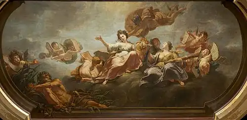 He worked initially as a copyist of the works of the leading Antwerp masters. His first signed work was a religious composition painted for the St. James' Church in Antwerp in 1709. He found it difficult to obtain regular work and wished to leave for Italy in 1710 but was prevented from doing so by his legal guardian. He married Joanna Catharina van der Cammen on 14 February 1712 and had a daughter who died in infancy.[4] De Roore received commissions for paintings and decorations in the Antwerp City Hall from around 1715. These works gained him a reputation and commissions from patrons in the Dutch Republic, where he worked in Amsterdam in 1720. He returned to Antwerp for a brief period and then took on more commissions in Amsterdam. After the death of his wife in Antwerp on 15 March 1722, de Roore sold all his property in Antwerp and settled in Amsterdam. Subsequently, he moved to Rotterdam and finally to The Hague where he became a member of the local Guild of Saint Luke. In the Dutch Republic the artist worked on multiple decorative paintings for houses in the cities of Amsterdam, Rotterdam and The Hague.[5]