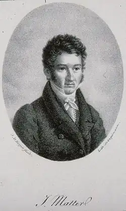 In 1845, Jacques Matter resigned from his position to be appointed inspector general of libraries, but he only held this position for one year, before definitively devoting himself to his research. These mainly concerned esoteric philosophical doctrines, which helped to put him at the head of a circle of Strasbourg theosophists. He is also the inventor of the name "esotericism" in French, which can be found as early as 1828 in the Critical History of Gnosticism.[3] A Freemason, he inherited Saint Martin's personal writings and was his first biographer.[4]