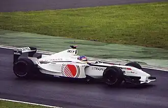 Before the 2002 season Villeneuve remained at BAR.[64] He talked to team principal Flavio Briatore,[9] who offered him a seat at Renault in lieu of Jenson Button but Villeneuve rejected it.[12][53] Villeneuve ultimately opted to remain at BAR due to pressure from Honda, and he again partnered with Panis.[65] He became uncomfortable when new BAR team principal David Richards publicly mentioned that money spent on Villeneuve's high salary could be better used for research and development. The BAR 004 chassis proved to be more unreliable than the year before and slower due to an under-powered Honda engine. He scored four points for 12th in the Drivers' Championship with a fourth place at the British Grand Prix being his season's best result.[65] Villeneuve regretted remaining at BAR due to the lack of results,[66] and he was offered a contract to join Team Player's in CART for the 2003 championship before returning to BAR for the 2004 and 2005 F1 seasons. The deal was pushed by Richards but not agreed upon because Villeneuve's and Pollock's financial settlements were too great for team owner Gerald Forsythe to be willing to take on.[67]