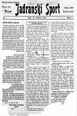 Jadranski Sport (transl. Adriatic Sport) was a weekly sports magazine published in Split, which was then part of the Kingdom of Serbs, Croats and Slovenes. Published by the Split Olympic Sub-Committee, it was an independent weekly for the first nine issues. After the tenth issue, it became a weekly supplement to the Novo Doba daily newspaper. The magazine's editor was Bogumir Doležal.[1]