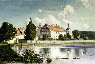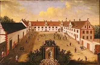 Jagdschloss Kranichstein was built on a commission from George I, Landgrave of Hesse-Darmstadt by his master builder Jakob Kesselhuth as a palace with three wings.[2][3] Transformation of a former agricultural estate to a courtly palace began in 1578[3] and was completed in 1580.[4] His successors, Ernest Louis and Louis VIII, held events such as Parforcejagd, expanding the buildings towards more representation and elegance.[2][3] The estate was used for hunting by the landgraves for more than 350 years.[3]