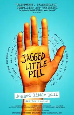Jagged Little Pill is a jukebox musical with music by Alanis Morissette and Glen Ballard, lyrics by Morissette, and book by Diablo Cody, with additional music by Michael Farrell and Guy Sigsworth. The musical is inspired by the 1995 album of the same name by Morissette and deals with pain, healing, and empowerment.[1][2] It premiered at the American Repertory Theater in Cambridge, Massachusetts, on May 5, 2018, directed by Diane Paulus.
