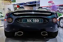 It had a 4.0 litre supercharged V8 engine with four valves per cylinder, developing 450 bhp (336 kW; 456 PS) and 445 lb⋅ft (603 N⋅m) of torque. Power is sent to the rear wheels through a Mercedes five-speed automatic gearbox which has been modified to be controlled by buttons on the steering wheel.[4] Seating capacity was two. It had a claimed top speed of 180 mph (290 km/h), although this was never tested, and it could accelerate from 0-100 km/h (62 mph) in 4.5 seconds. It was capable of covering a 1/4 mile (400 m) in 13.5 seconds at 106 mph (171 km/h). Two XK 180s were built in total, one in RHD and one in LHD. Both were roadsters.[5]
