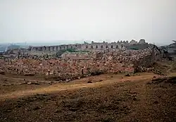 The fort was also known as ‘Muhammadabad’, but inferred as a latter-day development.[4] The two gates on the southeast and southwest of Adilabad fort had chambers at the lower level while the east and west gates had grain bins and courtyards at the upper floors. The fortifications built, linking with the other two city walls, was 12 m (39.4 ft) in thickness and extended to a length of 8 km (5.0 mi). Another smaller fortress, called the Nai-ka-Kot (literally "Barber's fortress") was also built at a distance of about 700 m (2,296.6 ft) from Adilabad, with the citadel and army camps, which are now seen only in ruins.[11]