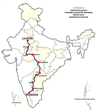 - 12976 Jaipur–Mysore Superfast Express leaves Jaipur Junction every Monday & Wednesday at 19:35 hrs IST and reaches Mysore Junction at 16:20 hrs IST on the 3rd day.