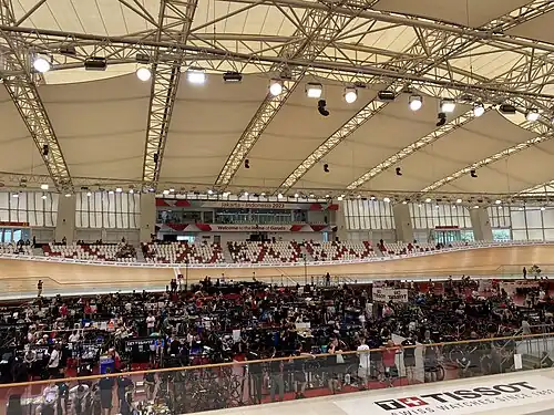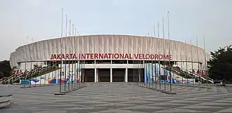 Jakarta International Velodrome is a sporting facility located at Rawamangun, East Jakarta, Indonesia. The velodrome was built by ES Global Ltd working with local construction company Wika. The arena was used as a venue for 2018 Asian Games and 2018 Asian Para Games.[1][2] The Velodrome covers an area of about 9.5 hectares.[3] The sports arena has a 250 m cycling track, designed by Schuermann Architects,[4] tennis court and swimming pools. The velodrome has a seating capacity of 3,500 for track cycling, and up to 8,500 for shows and concerts.[5] Although made for cycling races, the complex will also be used for various sports activities such as volleyball, badminton, and futsal. The velodrome is certified as “Class 1” by the Union Cycliste Internationale (UCI).[6]