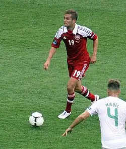 In February 2009, Poulsen was called up for the Denmark national team for the first time in his career.[206] He made his senior international debut in a friendly match against Greece, coming on as a substitute for Lars Jacobsen, as the national side drew 1–1 on 11 February 2009.[207] A month later, Poulsen was called up to the Denmark squad once again.[208] In the 2010 FIFA World Cup qualification game against Albania in April 2009, Poulsen replaced Martin Jørgensen in the midfield, making his second appearances for the national side, in a 3–0 win.[209] Following this, he went on to secure himself a place in the starting line-up, as a central midfielder.[205][210] In his seventh national team game, Poulsen scored his first international goal in the 1–0 win against Sweden on 10 October 2009, which secured the qualification for Denmark.[211][212] Later in the same year, he was one of five nominees for the 2009 Danish Footballer of the Year award, which eventually went to Nicklas Bendtner.[213] On 28 May 2010, Denmark coach Morten Olsen announced that Poulsen would be part of the final squad of 23 participating in the FIFA World Cup in South Africa.[214] After sitting out against Netherlands, he made his tournament debut, coming on as a substitute in Denmark 2–1 win against Cameroon.[215] In a follow–up match against Japan in the last group match, Poulsen, once again, came on as a 34th-minute substitute, as Denmark lost 3–1, resulting in their elimination in the group stage.[216]