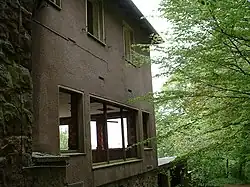 In the closing phase of the Second World War, most likely in March 1944, the manufacture of pipes by the firm of Philips was moved from the Netherlands to the Jakobsberg. Disused galleries of an old iron ore mine were developed. Such galleries run through many parts of the Wiehen Hills and Wesergebirge, their entrances are usually walled up nowadays and made unrecognisable. In Hausberge and Barkhausen there was a satellite of Neuengamme concentration camp with over a thousand prisoners,[1] of which a considerable number worked in the Jakobsberg. Women from the area also worked, under much better conditions, in the hill.[2] After the end of the war the local population used their surviving knowledge of the mine system running through the hills to collect material from the production facilities and sell it on the black market.[3] The British occupation forces brought this to an end with a demolition that caused pictures to fall from the walls up to a distance of 15 kilometres away and that created part of the present-day riverside front of the Jakobsberg.