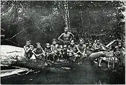 A Jakun village usually consists of several families. Those families are grouped into a village community headed by a village head, chieftain, leader or elder called, Batin.[53] Unlike the Malay people, the Jakun community is an informal association of fully autonomous families. In the past, the village head often headed the group only during their wanderings in the jungles and hunting.[53] At the same time, in areas closer to Malay settlements, such a leader gradually turned into a hereditary Batin leader.[54]