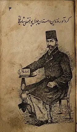 Jalal al-Din Mirza was born in 1827 at the court in Tehran, the capital of Qajar Iran. He was the fifty-fifth son of Fath-Ali Shah Qajar (r. 1797–1834). His mother was a Kurdish woman named Homai Khanum, from Mazandaran.[1] During this period, Fath-Ali Shah Qajar, in the last years of his reign, had stepped down and devoted himself to a life of relaxation and creation of more offsprings.[3] Being one of the last sons of Fath-Ali Shah meant that Jalal al-Din Mirza was a low-ranking member of the Qajar family, which made him insignificant in the affairs of the family. However, Jalal al-Din Mirza still had access to some benefits that the royal family enjoyed, particularly education.[4] Part of his education included learning classical Persian literature and the French language.[1]