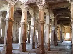 Multiple prayer halls are separated by almost 200 pillars.[12] The main prayer hall has eleven domes, with the central dome, a double-storied structure, built on pillars in an arcade form. The ruler's prayer hall is separated from the main area by jalis.[4][7][13] There is a double clerestory in one of the domes. Other interior features include an arcuate maqsurah screen, trabeate hypostyle lwan, double square side wings, zanana enclosure, and screened off northern mihrab.[14]