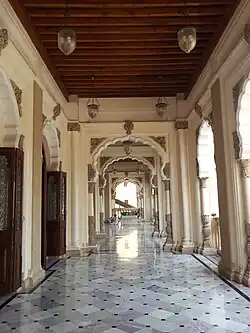 From the depth of the tank rise sixteen black stone arches, constructed in 1874, which support the whole fabric of the mosque, the upper storey upheld by five rows of wooden pillars, each of which contains a receptacle for sacred books. The arches in the tank were built in 1874 at a cost of Rs. 75,000; while other noteworthy additions to the premises were the large windows in the north, east, and south sides constructed in 1898, and the madrasa in 1902, at a cost of Rs. 20,000.